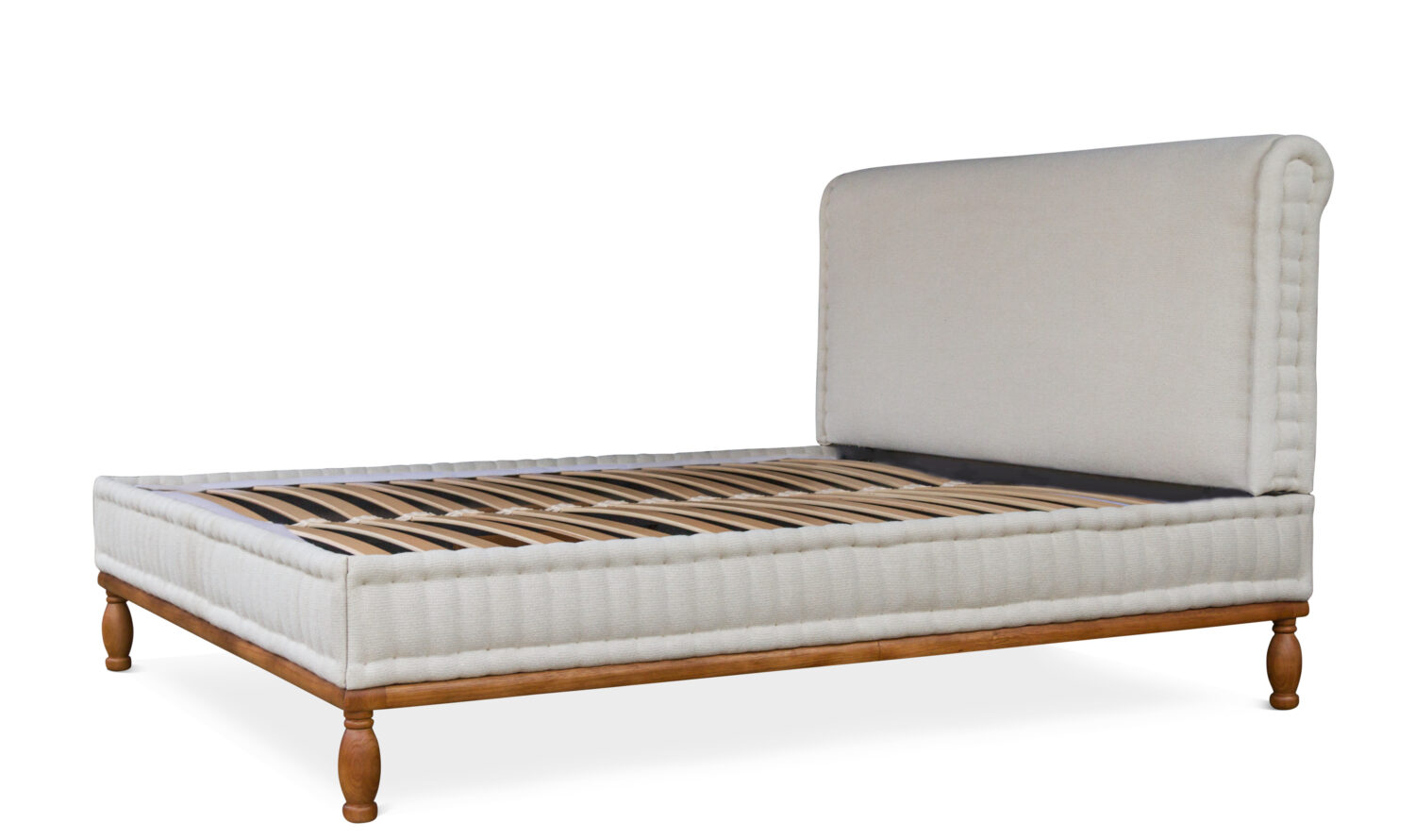 The Aubrey bed frame is made out of solid timber and features a upholstered headboard with quilted detail to the sides. Made with European orthopaedic slats. A sophisticated piece made in an enduring style.