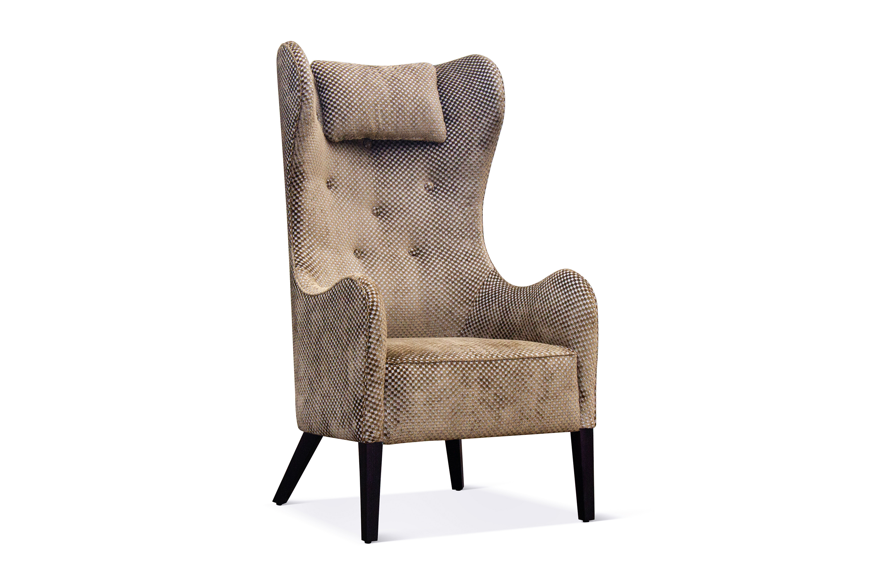 The Gabriella is a distinctly modern rendition of a traditional winged back chair. Featuring deep smooth curves and detailed upholstery the Gabriella makes for a stunning accent piece in any lounge, bedroom or office. Available with or without a headrest, in any selection of fabrics or leather, the Gabriella is made with turned timber legs stained wenge.