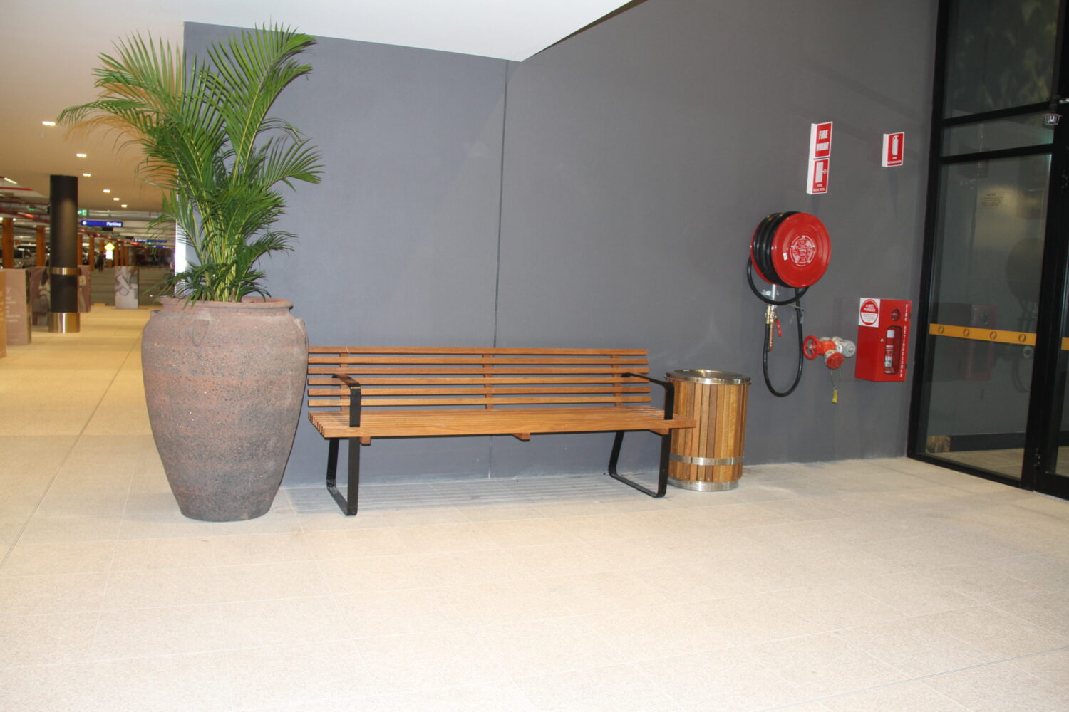 Seating area with our Bondi chairs, Jasper ottoman and custom curved ottoman for Stocklands Shopping Centre.
